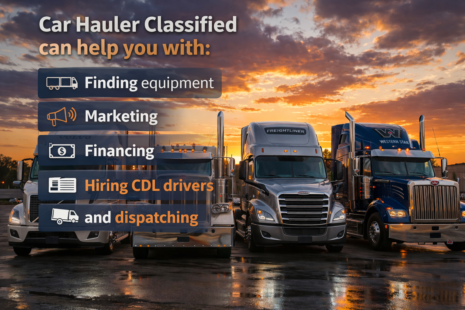 Car Hauler Classified is your one-stop shop for marketing, sales, financing, dispatching, and insurance solutions to help grow and support your trucking business